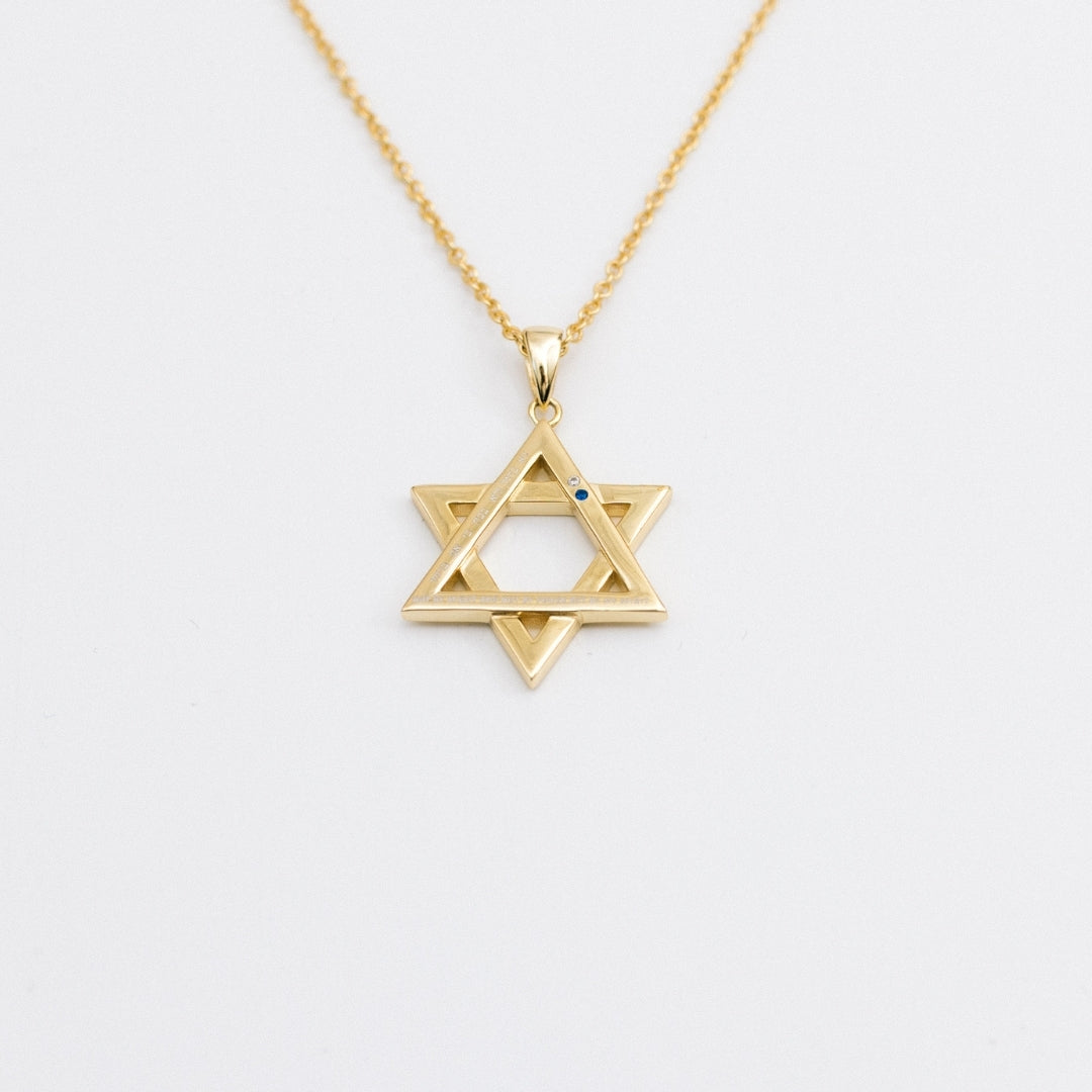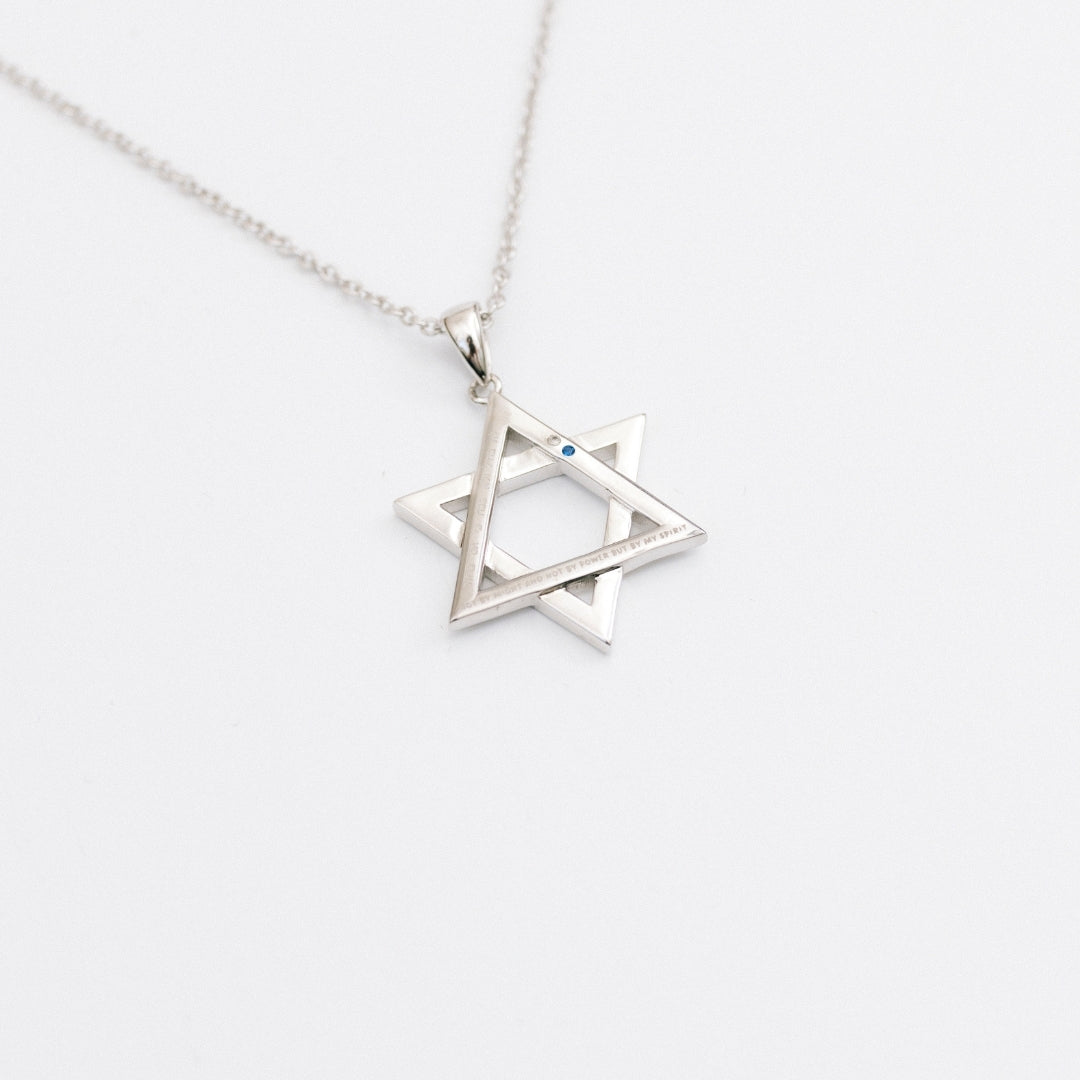 The inscription reads, "not by might and not by power but by my spirit / לא בחיל ולא בכח כי אם ברוחי" and the back has the date we will never forget - "October 7, 2023 / 22 תשרי 5784" -The blue and white gems signify the flag of Israel.