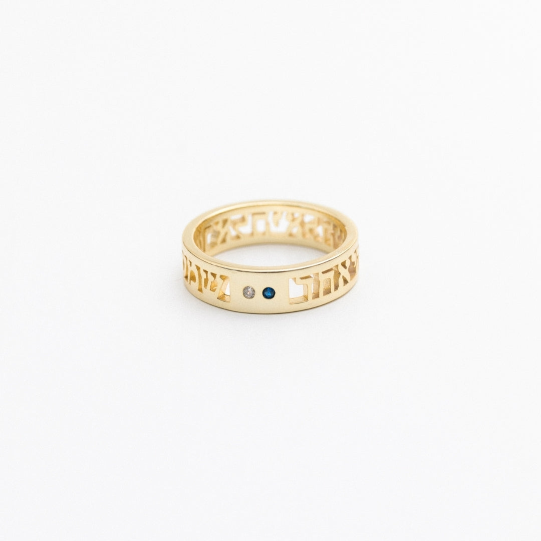 The Shema prayer ring features a stunning blue and white gemstone set in tribute to Israel. Engraved with the powerful words of the Shema, this ring symbolizes faith, unity, and the unbreakable bond with our heritage and homeland. Wear it as a daily reminder of strength, devotion, and Jewish pride.