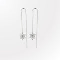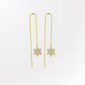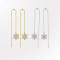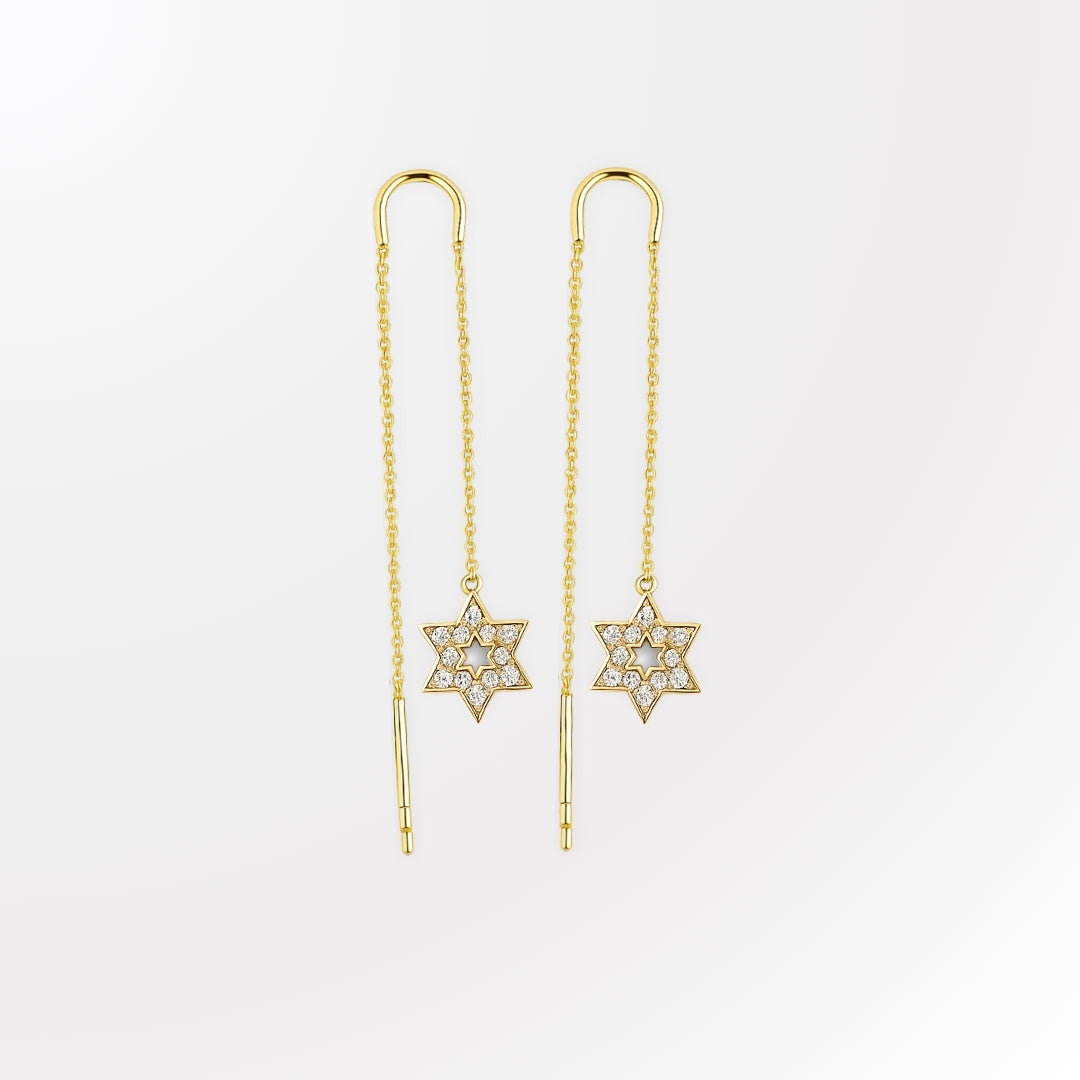 A delicate statement. This long, elegant thread earring features a small Magen David star charm dangling with a white gem and an open cutout center. These earrings symbolize both inner light and outer strength. Lightweight, luminous, and perfect for a day or night out!